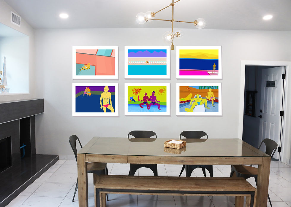 These pieces draw inspiration from Matisse’s late cut-outs, but with a distinctly Hastings' twist. Each begins with a photograph I’ve taken of the model. I use Photoshop to isolate the figure, then add in the “essential” details—nipples, genitals, and attitude. From there, I build a digital environment for them to inhabit.